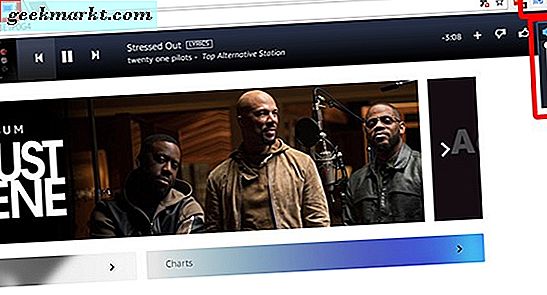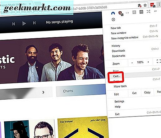 Sobald Sie diesen Web-Player auf Ihrem Computer in Chrome geöffnet haben, tippen oder klicken Sie auf das dreifach gepunktete Menüsymbol in der oberen rechten Ecke Ihres Browsers, um das Chrome-Menü zu öffnen. Bewegen Sie den Mauszeiger zum unteren Ende des Menüs, bis Sie die Option "Cast ..." finden und klicken Sie darauf. Es ist wichtig, dass Sie sich immer noch auf dem Tab befinden, auf dem die Musikseite von Amazon geöffnet ist, sonst funktioniert das nicht.