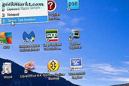 Testen Sie zunächst einige der voraufgezeichneten Makros, um eine bessere Vorstellung davon zu erhalten, wie die Software funktioniert. Bewegen Sie den Mauszeiger auf die obere linke Ecke des Desktops. Das sollte ein kleines Menü wie im folgenden Schnappschuss öffnen, aus dem Sie vier der voraufgezeichneten Makros auswählen können. Wählen Sie den Editor, um das Editor-Fenster zu öffnen.