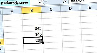 Wählen Sie Zelle B5 und klicken Sie in die FX-Leiste, um eine Formel einzugeben. Geben Sie die Formel '= B3-B4' ein und drücken Sie die Eingabetaste. B5 gibt nun den Wert 200 zurück, wie unten gezeigt.
