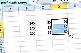 Kopieren Sie die Formel in D3 in die anderen Zellen darunter, indem Sie D3 auswählen, auf die untere rechte Ecke der Zelle klicken und sie wie unten gezeigt über die darunter liegenden ziehen. Jetzt subtrahieren die Zellen direkt unter D3 auch 5 von den Zahlen in C4 und C5.