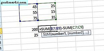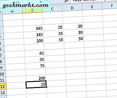 Geben Sie beispielsweise in den Zellen B7 bis B9 die Werte '45, '' 55 'und' 75 'ein. Geben Sie dann '200' in Zelle B11 ein. Markieren Sie die Zelle B12, klicken Sie in die FX-Leiste und geben Sie in der Bearbeitungsleiste '= B11-SUM (B7: B9)' ein. Zelle B12 gibt dann den Wert von 25 zurück, wie direkt unten gezeigt. Dies zieht effektiv die Summe der Zellen B7: B9 von 200 in Zelle B11 ab.