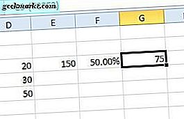 Jetzt können Sie eine Formel hinzufügen, die 50% von 150 subtrahiert. Klicken Sie auf Zelle G3 und geben Sie in der Funktionsleiste die Formel '= E3- (F3 * E3)' ein. Zelle G3 wird einen Wert von 75 zurückgeben, was 50% von 150 ist. Somit hat die Formel 75 von 150 abgezogen.
