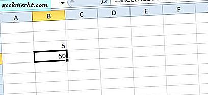 Klicken Sie nun in Sheet2 auf B4, um die Formel zu dieser Zelle hinzuzufügen. Geben Sie die Formel '= Sheet1! B14-Sheet2! B3' in der Excel-Funktionsleiste ein und drücken Sie Return. Zelle B4 zieht jetzt 5 in B3 von Sheet2 von B14s Wert in Sheet1 ab. Die Zelle gibt einen Wert von 50 zurück, wie Sie wahrscheinlich vermutet haben.