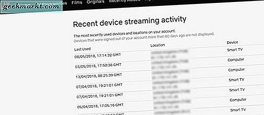 In Schritt 4 erfahren Sie genau, welche Geräte auf Ihr Netflix-Konto und deren IP-Adresse und Standort zugegriffen haben. Der Standort ist möglicherweise nicht genau, abhängig davon, wo Ihr ISP Sie angeschlossen hat. Dies kann je nach Tageszeit, Upgrades oder geplanten Arbeiten und einer Reihe anderer Gründe variieren. Es sollte immer in relativ naher Nähe sein, aber möglicherweise nicht Ihre genaue Nachbarschaft oder Stadt identifizieren. Das Gerät sollte jedoch aussagekräftiger sein.