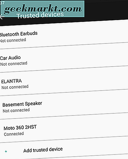 - Vertrauenswürdige Geräte: Dies ist möglicherweise die beste der fünf Smart Lock-Optionen, da sie ideal ist, um Ihre Geräte sicher zu halten, wenn Sie in der Nähe sind, und Ihr Telefon gesperrt zu lassen, wenn Sie gegangen sind. Besitzen Sie eine Smartwatch, einen Fitness-Tracker, einen Satz kabelloser Kopfhörer oder ein anderes Gerät, das über Bluetooth synchronisiert? Sie können vertrauenswürdige Geräte verwenden, mit denen Sie Ihr Telefon entsperren können, wenn Ihr Telefon mit Ihren Gadgets gekoppelt ist. Smartwatches und Fitness-Tracker sind ideal dafür, aber es hilft Ihnen auch, Ihr Telefon entsperrt zu halten, wenn Sie in Ihrem mit Bluetooth ausgestatteten Auto fahren, wenn Sie mit Bluetooth-Kopfhörern laufen oder wenn Sie mit einer Reihe von Bluetooth-Lautsprechern gepaart sind.