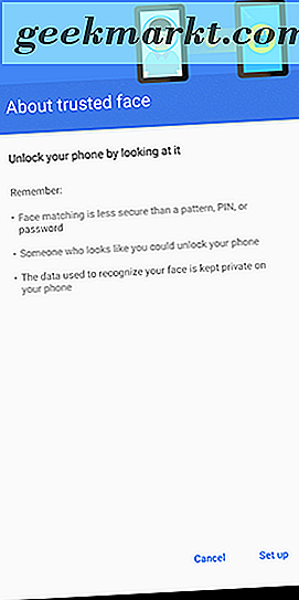 - Vertrauenswürdiges Gesicht: Viele Telefone haben eine Gesichtsentsperrung, obwohl keine von ihnen so sicher ist wie die FaceID-Methode auf dem iPhone X. Wenn Sie möchten, können Sie auf Ihrem Gerät jedoch auch "Vertrauenswürdiges Gesicht" aktivieren, um Ihre Kamera zuzulassen um Ihr Telefon automatisch zu entsperren, wenn es Sie erkennt. Trusted Faces lässt sich jedoch viel leichter täuschen als die oben genannten Methoden, zumal ein Foto von Ihnen - oder sogar ein Lookalike - Ihr Telefon entsperren kann, ohne dass Sie eine Sicherheit verwenden müssen. Benutze dieses mit Vorsicht.