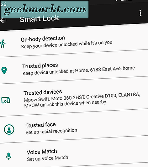 Smart Lock ist eines dieser Features, das wie ein Kinderspiel aussieht, da es so verdammt einfach ist, es einzurichten und zu Ihrem Vorteil zu nutzen. Allerdings wirft die Verwendung von Smart Lock offensichtlich Sicherheitsbedenken auf, da Ihr Telefon dadurch öfter freigeschaltet wird. Sie sollten mit Smart Lock herumspielen, um die richtige Kombination aus Sicherheit und Benutzerfreundlichkeit für Sie zu finden. Vielleicht bedeutet das, das Gerät zu entsperren, wenn es an der Bluetooth-Funktion Ihres Autos angebracht ist und wenn Sie zu Hause sind, aber es bei der Arbeit gesichert ist und die On-Body-Erkennung deaktiviert bleibt. Was auch immer die richtige Kombination für Sie ist, wird wahrscheinlich eine persönliche Entscheidung sein, aber mit fünf verschiedenen Smart Lock-Modi stehen Ihnen viele Optionen und Kombinationen zur Auswahl.