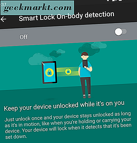 - Körpererkennung: Mit dieser Einstellung können Sie Ihr Gerät einmal entsperren, bevor Sie die Sperre deaktivieren, solange sich das Telefon in Ihrer Hand oder an Ihrer Person befindet. Wenn Sie das Sensor-Array Ihres Smartphones verwenden, wird das Gerät bei Verwendung des Geräts verfolgt, sodass Sie das Display ausschalten können, das Telefon jedoch in der Hand entsperrt bleibt. Wenn Ihr Telefon erkennt, dass es eingerichtet ist, wird das Telefon automatisch neu gesperrt und erfordert ein Kennwort. Dies ist nicht die sicherste Methode, die Smart Lock bietet, aber es ist ziemlich cool.