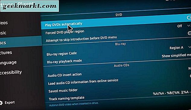Sie können den Film auch so konfigurieren, dass er nach dem Einlegen seiner Disc automatisch in Kodi abgespielt wird. Klicke auf das Zahnradsymbol oben in Kodis Sidebar und wähle Player-Einstellungen . Wählen Sie Discs in der Kodi-Seitenleiste aus, um die Einstellungen zu öffnen, die im Schnappschuss direkt darunter angezeigt werden.