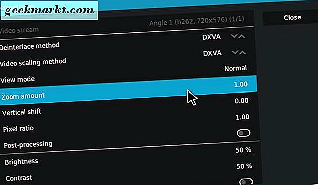 Drücken Sie die Einstellungen- Taste ganz rechts auf der Wiedergabesteuerung, um weitere Optionen zu öffnen. Klicken Sie dann auf Videoeinstellungen, um die Optionen zu öffnen, die im Schnappschuss direkt darunter angezeigt werden. Dort können Sie den Anzeigemodus konfigurieren, indem Sie auf Ansichtsmodus klicken. Um schwarze Balken zu entfernen, die sich möglicherweise noch immer um den Film befinden, wählen Sie Zoom, um den Film zu beschneiden. Oder Sie können den Zoom-Betrag auswählen und die Leiste ziehen, um sie manuell zu konfigurieren. Wenn der Film etwas dunkel ist, klicken Sie auf Kontrast, um den Kontrast zu erhöhen.