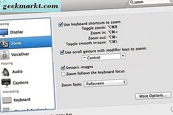Um sicherzustellen, dass der Zoom aktiviert ist, wählen Sie im linken Bereich des Menüs Eingabehilfen die Option Zoom aus und aktivieren Sie das Kontrollkästchen neben Verwenden von Tastenkombinationen zum Zoomen, Verwenden der Bildlaufgeste mit Zusatztasten zum Zoomen und Glätten von Bildern. Sie können den Zoom-Stil dann so anpassen, dass er Ihren Bedürfnissen am besten entspricht.