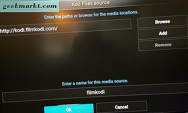 - Wählen Sie im Dateimanager Quelle hinzufügen. Dann wird das Feld Dateiquelle hinzufügen auf dem Bildschirm angezeigt. Wo es heißt, geben Sie http://kodi.filmkodi.com und klicken Sie dann auf die Schaltfläche "Fertig". Als Nächstes geben Sie im Feld Geben Sie einen Namen für die Medienquelle ein filmkodi ein und klicken erneut auf Fertig. Klicken Sie abschließend auf die Schaltfläche OK.