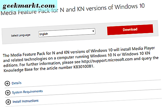 Sie können das Windows 10 Media Feature Pack direkt von Microsoft hier herunterladen.